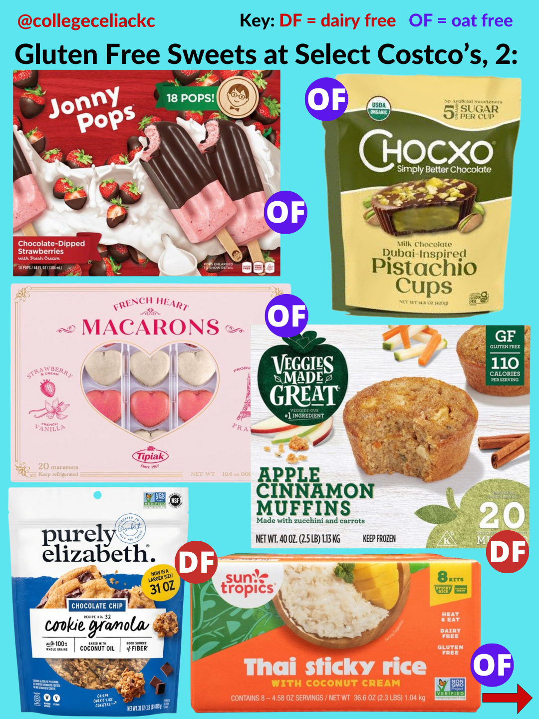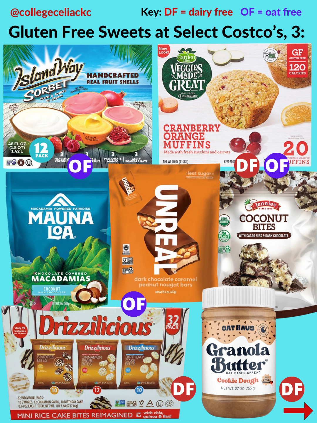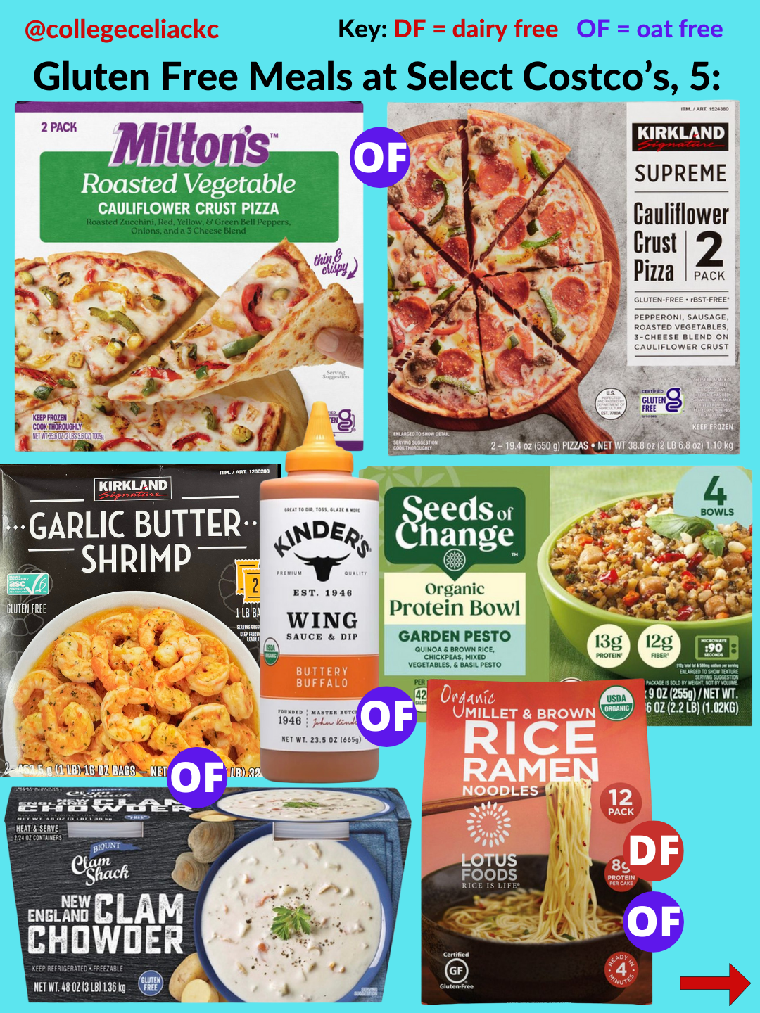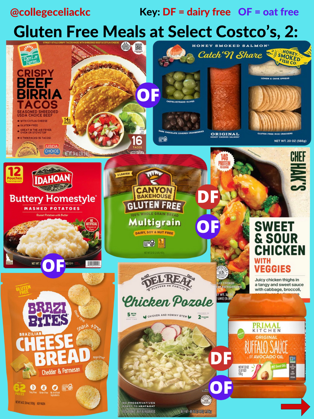 If you’re looking for the best new gluten free products at Costco as of January 2026, this is the post for you. Keep reading to discover 109+ gluten free foods at US Costco’s now. All gluten free and dairy free foods are indicated with the red “DF” button and oat free options are marked with the purple “OF” button.